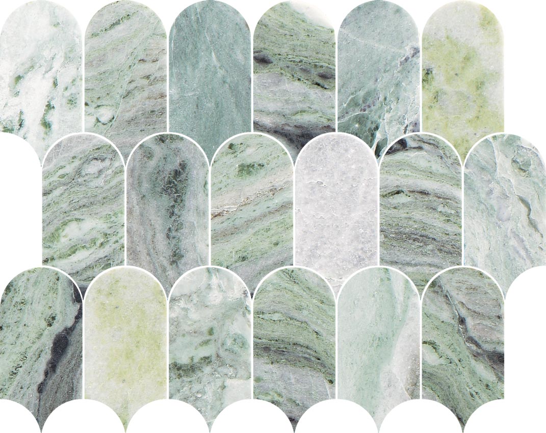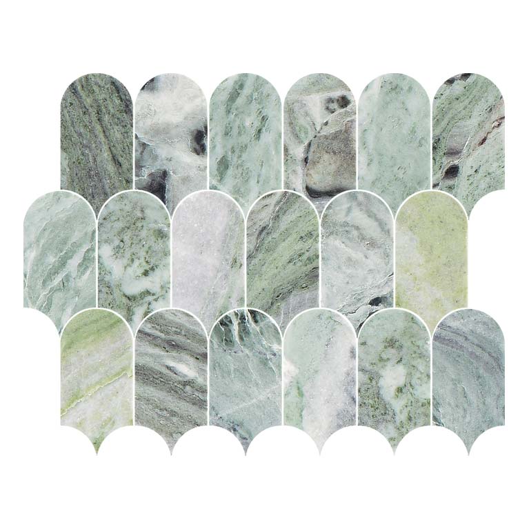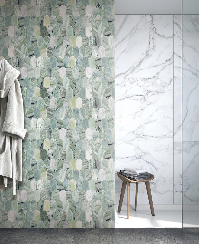The Coastline Collection features an elongated fish-scale shape which is sure to make a statement in your kitchen, bar or bathroom. Suitable for both walls & floors, this collection uses the beauty of natural marble stones with a unique shape to create this ultimate expression of urban chic. The collections feature 3 colour; Valentino Bianco, Oliva Verde and Versilia River Blu.