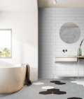 This porcelain tile features soft grey colour in a matte finish. Available in 10″ Hexagon with rectified edges. These tiles contain 38% post-industrial (in-house) recycled content.