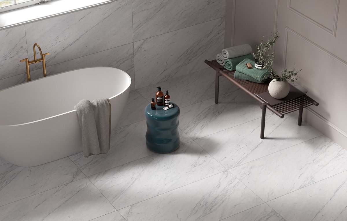 Bianco Barga captures the pristine elegance of white Carrara marble, with delicate grey veining flowing across a clean white base.