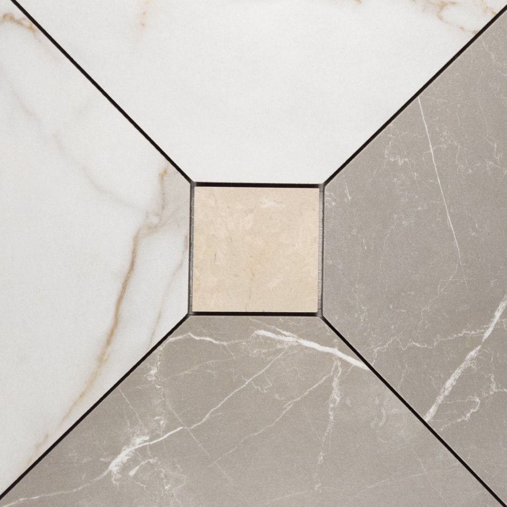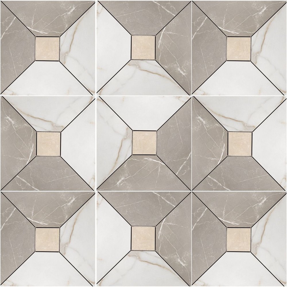 This squared mosaic elegantly combines Cenere Murcia (grey), Oro Versilia (white/gold), and Crema Rezzato (cream) from the Majestic collection in a refined geometric diagonal pattern.