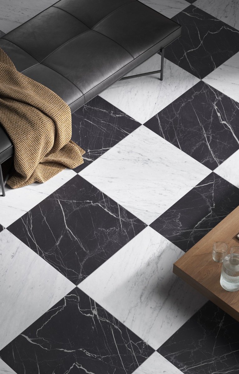 Nero Bilbao features a striking deep black base with bold white veining, capturing the dramatic character of Nero Marquina marble.