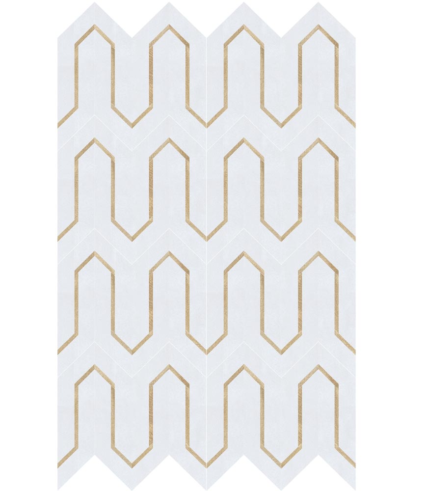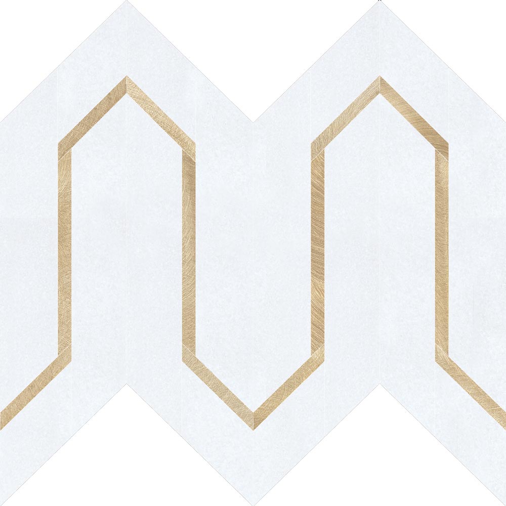 The UrbanLife™ Collection features marbles in a geometric pattern and requires minimal grouting. Oro Thassos combines brushed aluminum gold details with a natural white marble with no veining. Perla Volkas combines the mother of pearl and marble with grey and brown veining.