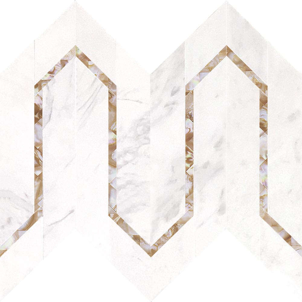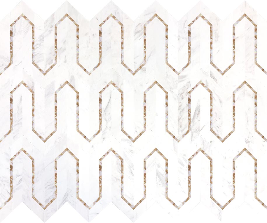 The UrbanLife™ Collection features marbles in a geometric pattern and requires minimal grouting. Oro Thassos combines brushed aluminum gold details with a natural white marble with no veining. Perla Volkas combines the mother of pearl and marble with grey and brown veining.